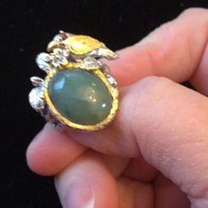 Super stunning this artistic one of a kind creation is creatively crafted with high quality Jade and a genuine buy. Crafted in sterling silver and genuine 14 K gold applications. This is a great investment piece, it is so unusual and intricately detailed.