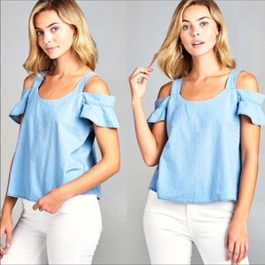 Last 1❣Chambray Cold Shoulder Ruffle Top