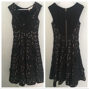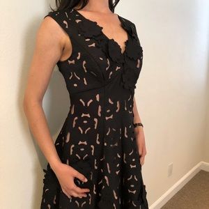 BRAND NEW WITH TAGS Moulinette Souers from Anthropologie cocktail dress. Overlay cuts showcase taupe material behind. Dress fans out. Lined. Long zipper up back.
