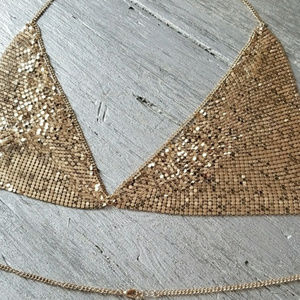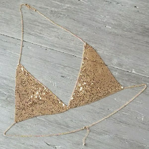 This gold metal mesh bralette is fun for all season a d can be styled.in so many ways, wear as seen with shorts for pair under a low cut top, wear over your bikini top. Sky is the limit with this piece.