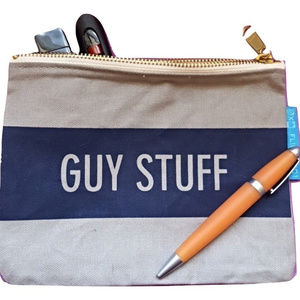 New (without tags) Flight 001 pouch. Grey canvas accent with navy stripe and grey text clearly stating "Guy Stuff."