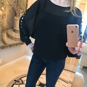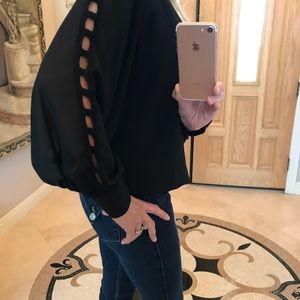 Beautiful black XOXO blouse with detailed cutout long sleeves, elastic waist, 3 button sleeve. 100% Polyester Top with 100% Polyester lining. Can dress up with skirt or go casual with jeans. No tags, but never worn.