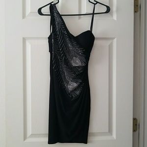 One shoulder black mini dress with jeweled feathers on front