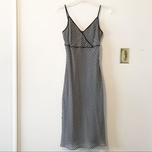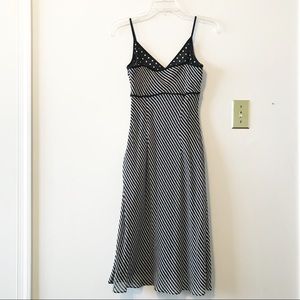 Black and white; sheer striped fabric and polka dot underlay; empire waist; a-line; side invisible zipper closure; material: shell 100% silk, and lining 100% polyester; measurements: pit-to-pit 15.5”, waist 13.5”, back length 34”; note: there is a small run in the back, although not noticeable when worn (refer to last photo); size 0; made in Korea.
