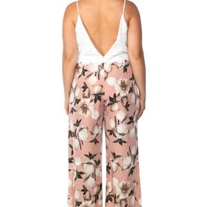 Our Carmen Lace Floral Jumpsuit is a showstopper! Blush pink floral pants with a V-neck plunge lace crochet top bring this wide leg jumpsuit together for a pretty, feminine look. Perfect for so many occasions!