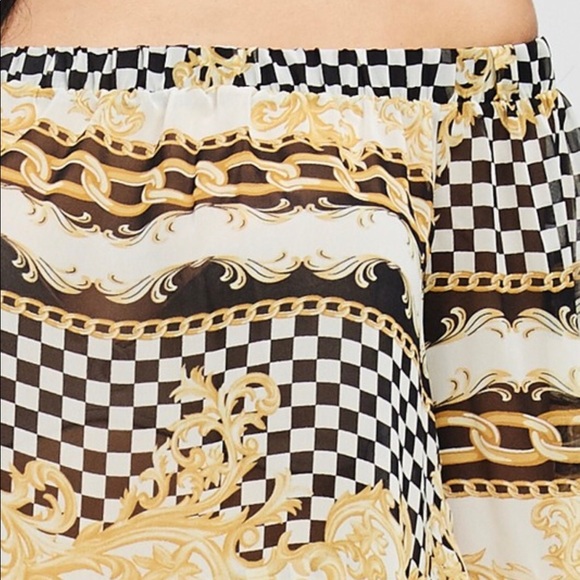 This trendy & sexy set has a sheer loose fitting top, thick elastic neckline worn off shoulders with tie closure sleeve. Top does not have any stretch. Pants has elastic waist and is very stretchy.