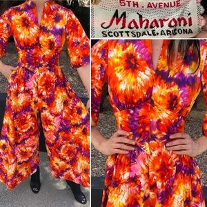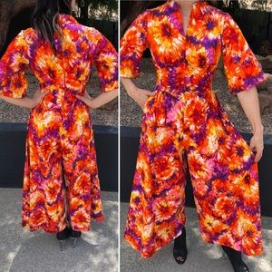 Most amazing colorful floral vintage jumpsuit with large bellbottoms and bell sleeves, form fitting very flattering!