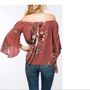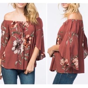 New! Off-shoulder floral top. 3/4 sleeves Mauve floral print with front tie detail.
