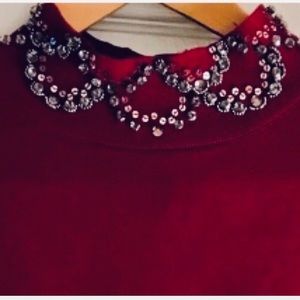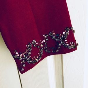 New with tags scarlet red sweater with beautiful embellishments around neck and sleeves. Sleeves slightly belled. Deep scarlet. Gorgeous!
