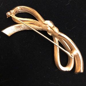 Beautiful vintage pre-1970 gold toned brooch in the shape of a ribbon tied into a bow. Designed and made by Trifari. Mint condition. Measures approximately 2.5”W by 1”H. See pictures for details!