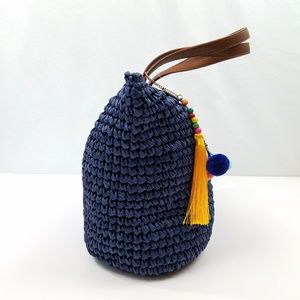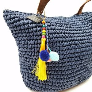 Navy Raffia Crochet Tote Bag Pom Pom Tassle