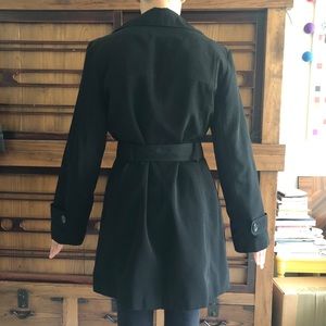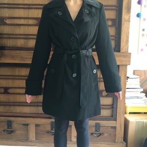 NWOT black London Fog trench coat with shell-look black and grey buttons. Tie around waist for flattering fit can be removed and worn with or without. Pockets are all functioning.