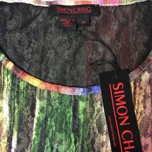 Simon Chang Women's Rainbow Color 3/4 Sleeve Stretch Top. Shear Lining with Colorful Lace Overlay, Greens, Blues, Purples, Yellows. A Great Addition to your Wardrobe! 95% Polyester, 5% Spandex. Hand Wash Cold, Flat Dry. MSRP: $99.