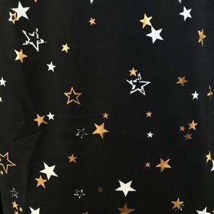 NO TRADES. New with tag. Super-cute shirt dress with metallic gold and white star print. Buttons in front. Shirttail hem. Unlined. 100% polyester. Relaxed fit. Small is 33” long, 21.5” across from armpit to armpit. So cute with tall boots, skinny jeans or leggings! First 2 pics are stock photos, rest are actual item.