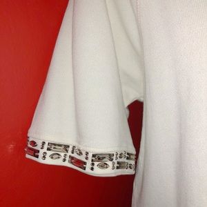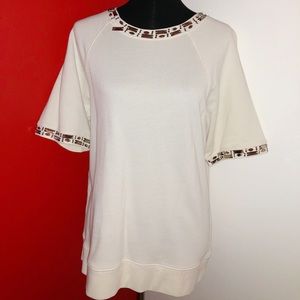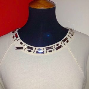 Cream colored bejeweled J.Crew top. The gorgeous jewels help make this shirt a unique blend of glitz and comfort. Dressed up with denim and cute shoes, this is a hit! Size: XL. Flaws: one jewel is loose but that’s an easy fix!