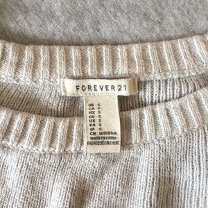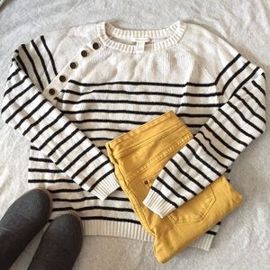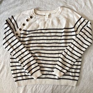 forever 21 off white sweater with navy stripes and navy/gold buttons on right shoulder. slightly oversized fit, soft and cozy knit. there is a faint bluish spot near the buttons under the collar, possibly dye that bled during a wash. it’s pretty difficult to see unless you’re looking for it though. 100% acrylic.