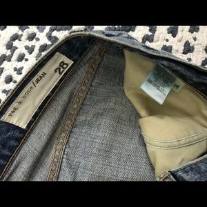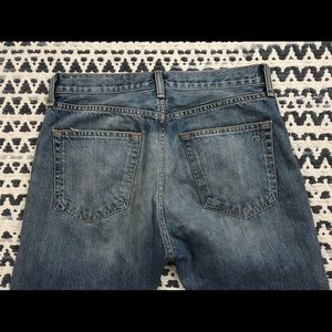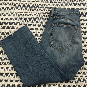 Rag & Bone high waisted jeans. Medium wash. Straight cropped leg with cut off hem. Heavy weight denim. Light distressing. Size 28.