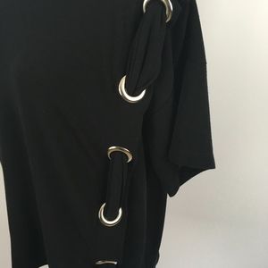 Crew neck - Short dolman sleeves - Slips on over head - Stretch knit construction - Oversized grommet side detail with self-tie bow detail - Approx. 25" length (size S)