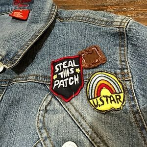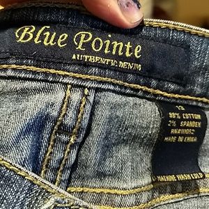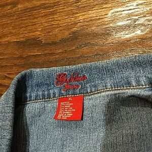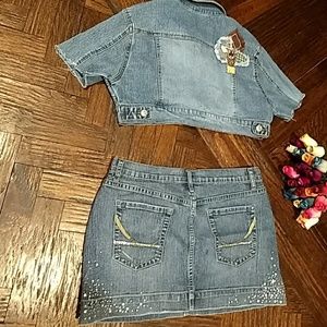Blue pointe Authentic Denim mini skirt 2 PC set and goddess.jeans mini jacket short sleeve. size skirt have some of little crystals but luck nice (13)98%cotton 2%spandex and mini goddess jeans jacket.(XL)55%Ramie 22%cotton 20%polyester 3%spandex .the two made in China is and good condition