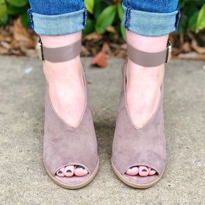 A modern and trendy sandal that's both comfortable and stylish. Features a faux suede upper with a V-cut vamp, peep toe, stacked heel, and a wrap ankle strap for an easy fit.