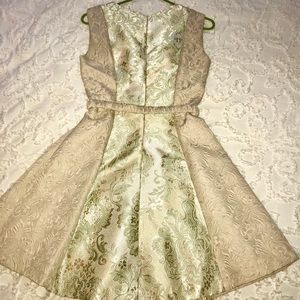 This stunning brocade dress is the perfect party dress. The heavy material looks very expensive, and wears nicely with beautiful shape. The vintage-look is enhanced with metallic fabrics that give some sheen. This dress is full lined, and the a-line skirt has some nice body. Size Medium, fits a 4-6. Purchased from a boutique In Lexington, KY