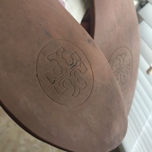 * Signature golden Tory Burch double-"T" logo.