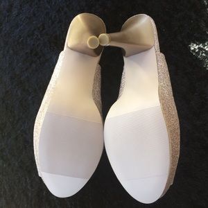 Never worn, but have flaw (read below). Madden Girl ‘Oaklannd’ platform peep toe heels in gold glitter. Adjustable slingback heel strap.