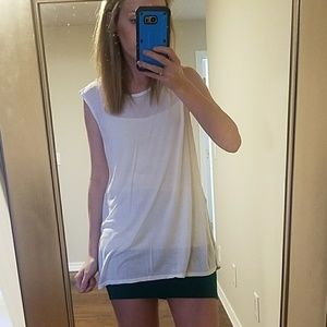 See through. I am wearing a tank top slip underneath. Super universal tee that can be worn with jeans, skirts, shorts, ANYTHING. Excellent condition. Price firm