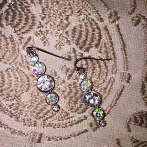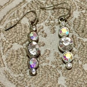 Gorgeous drop earrings by Lia Sophia. Silver hardware with 5 rhinestones in a row. Two of the rhinestones have an iridescence that adds an extra sparkle. These have a 1 1/2 inch drop.