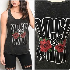 A must have! Perfect Rock & Roll roses graphic racer back tank tee. Mineral wash background with a