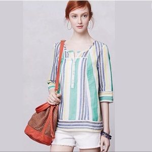 Anthro MERMAID Striped Linen Blouse Popover Peasant Top Shirt Blue Green Yellow