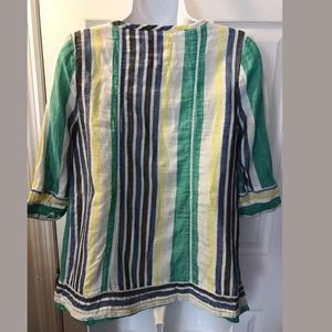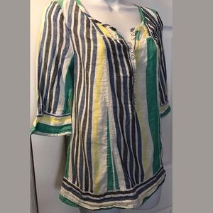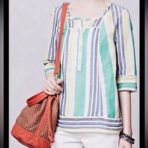 This is a beautiful Anthropologie MERMAID Long Beach Popover Peasant Top Blouse Shirt. It has a green, blue, yellow, white & a gray black striped Linen blends material, partial length buttons and 3/4 sleeves. Perfect for a casual day at the beach. Check out my other beautiful Shirts! In excellent condition! No material tag, but is a cotton linen blend.