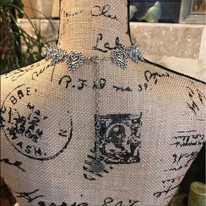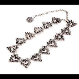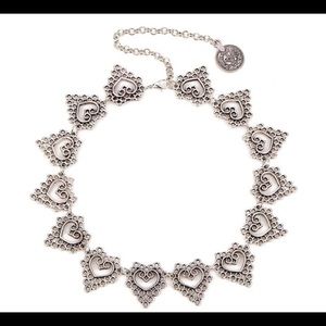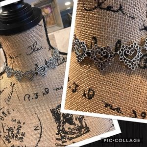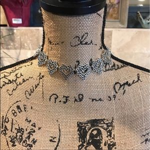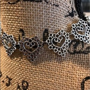 Antiqued silver tones. Bohemian, vintage inspired filigree heart choker