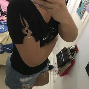 This is a black graphic tee. NWOT. Features a fun and quirky saying in the front. Both sleeves have silver hardware details. Super cute to dress up or down. NO TRADES!