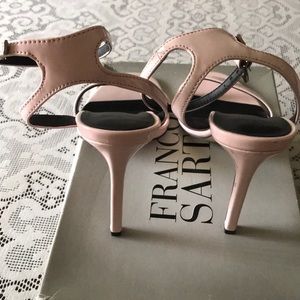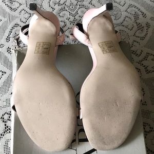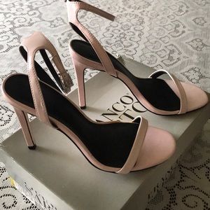 The ASOS HEADS OR TAIL heeled sandals are made from 100% Polyurethane in the color pale pink. They have an open toe front with a pin buckle ankle strap. The heel is 4 inches with a 100% Resin sole. Wore once and are like new. Does not come with original box.