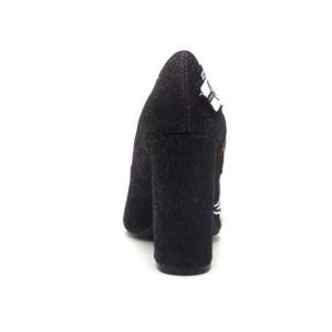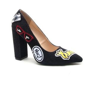 Add these cuties to your shoe collection! Features include, a denim fabric, embroider graphic patches, and a cushioned foot bed. Approximately a 4 inch chunky heel.