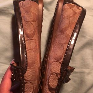 Brown in color and hardware is gold. Shoes are used but they have a lot of life left. Comes from a smoke free home. You can see it has some peeling on the back but you can’t see it when you are wearing it.