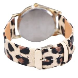 On the face is a Cat with glasses on the outside and Cat ears on top. The metal is gold tone. The band has a Leopard print on it. Great watch for any cat lover! Arrives in protective packaging.