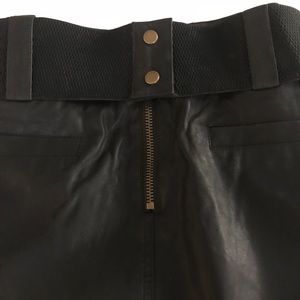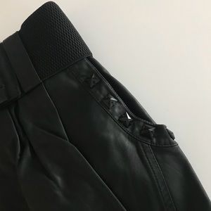 Black Leather Skirt with embellished studs. Is so sleek and chic. 3 available sizes. 2 Medium 1 Small. I am wearing a size small. The waist belt is incredible because it adjusts to your waist size in case it fits a little big. Super comfy and pairs with everything I own! 50% Chemical Fiber Lining 100% Polyester. Perfect for street fashion, office wear, or going out. Comes 100% New in original packaging. Pictures are for reference.