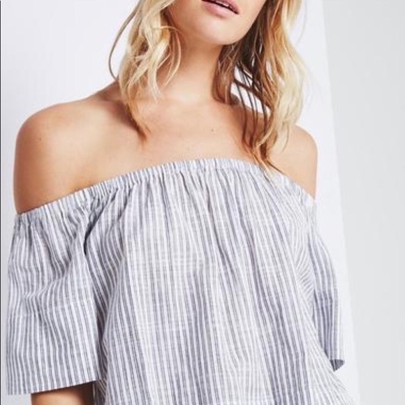 AG Striped Top off shoulder, elasticized neckline. White with dark navy stripes. Breezy, flowy top, super light, you can fold it and pack it and won't get wrinkles. Super stylish. Dress it up or down. Perfect spring/summer top. 100% Cotton. Machine Wash (refer to tag for further care instructions). Size Large. BNWT