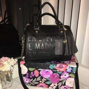 Black faux leather bag with STEVE MADDEN logo throughout, Zipper closure,Two rolled carrying handles.