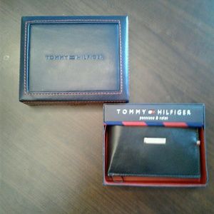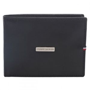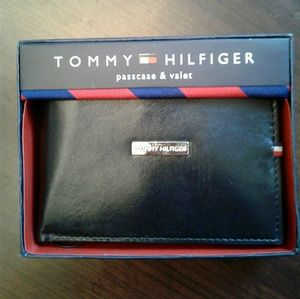 Bi-fold pass case wallet with silver-tone Tommy Hilfiger metal nameplate and stitching details.