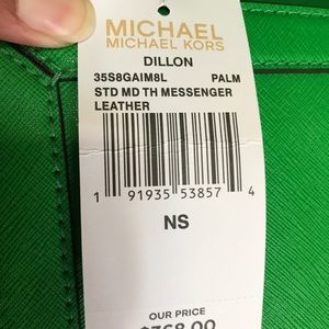 STYLE: 35S8GAIM8LColor: PalmFrom MICHAEL Michael Kors Dillon Stud collections itemSaffiano Leather w/ studs accent on frontGold tone Hardware Michael Kors lettering logo on front Magnetic Flap closure Interior: 1 zippered pocket, 3 Credit Card slots MK signature fabric lining 9" (L) x 7.5" (H) x 3.5" (D) w/ 3.5" handle & 22” adjustable Removable long strap. NO DUST BAG. Wallet:7 1/2" W x 3 1/2" H x 1/2"D