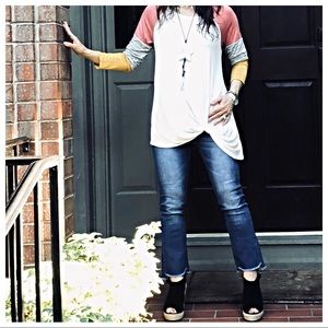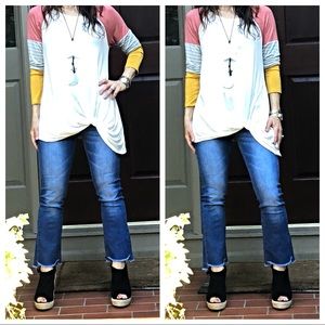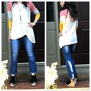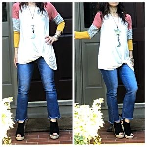 Color block twist front top Made in the USA model is wearing size small Measurements Bust laying flat on one side S 18.5 M 19.5 L 20.5 length S 28.5 M 29 L 29.5