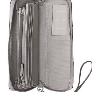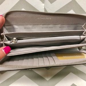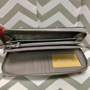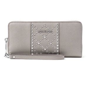 Michael Kors money piece travel continental zip around wristlet/Wallet. Includes polished silver ton stud detail with a lot of storage space.