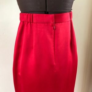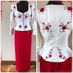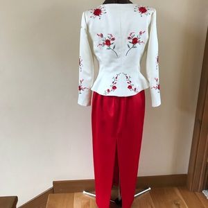 From designer Victor Costa, this 2-pc skirt and jacket gown is stunning. Beautiful true red skirt with back flap, zipper and clasp. Slight elasticity in back for waist that goes from 13-14”. Length is 42.5”. Slight run that is hardly noticeable but see close up pic. Jacket is stunning with red bead buttons, floral appliqué and beaded. Jacket measures 18” under arms, 15.5” waist, 20.5” length and 23” sleeves. Both size 6 and fully lined.