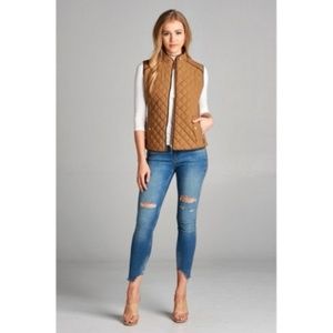 Dark Tan Basic Vest with Suede Piping Detail. Features- Contrast stretch fabric on sides, functional front side zipper pockets, lightweight, cozy silky inside, gold color buttons and zippers. button and zip front closureRun on small side, recommended to choose one size up.