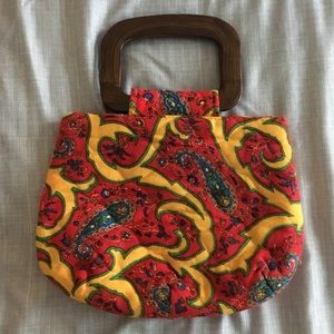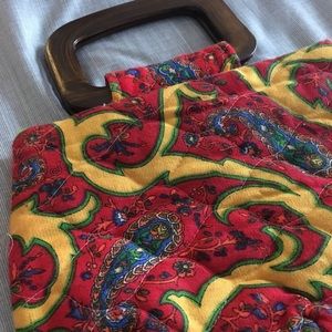 Appears to be handmade. Perfect condition. Features inside pockets and two wooden handles. Very retro and unique. I love this little purse! Hand Quilted pattern sewn into a bright paisley fabric.