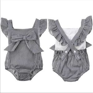 Adorable black and white romper. This romper is a cotton polyester blend. Super cute for warm days. With adjustable back buttons and snap bottom.