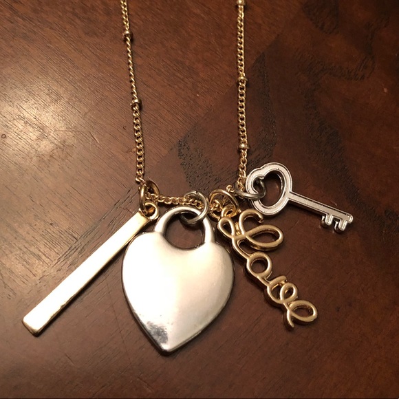 Beautiful Silver Toned and Gold Toned Charm Necklace. Lobster Clasp Closure. Charms include a Gold Toned Bar, a Gold Toned “Love” Charm, Silver Toned Key and Silver Toned Heart. Hard to get a good picture due to lighting. brand New Never Worn.